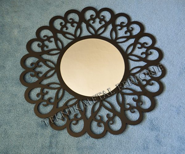 Ferforje lazer kesim olarak imal edilmiş yuvarlak şekilli kenarları desenli evinizde dekoratif amaçlı kullanabileceğiniz ayna.
